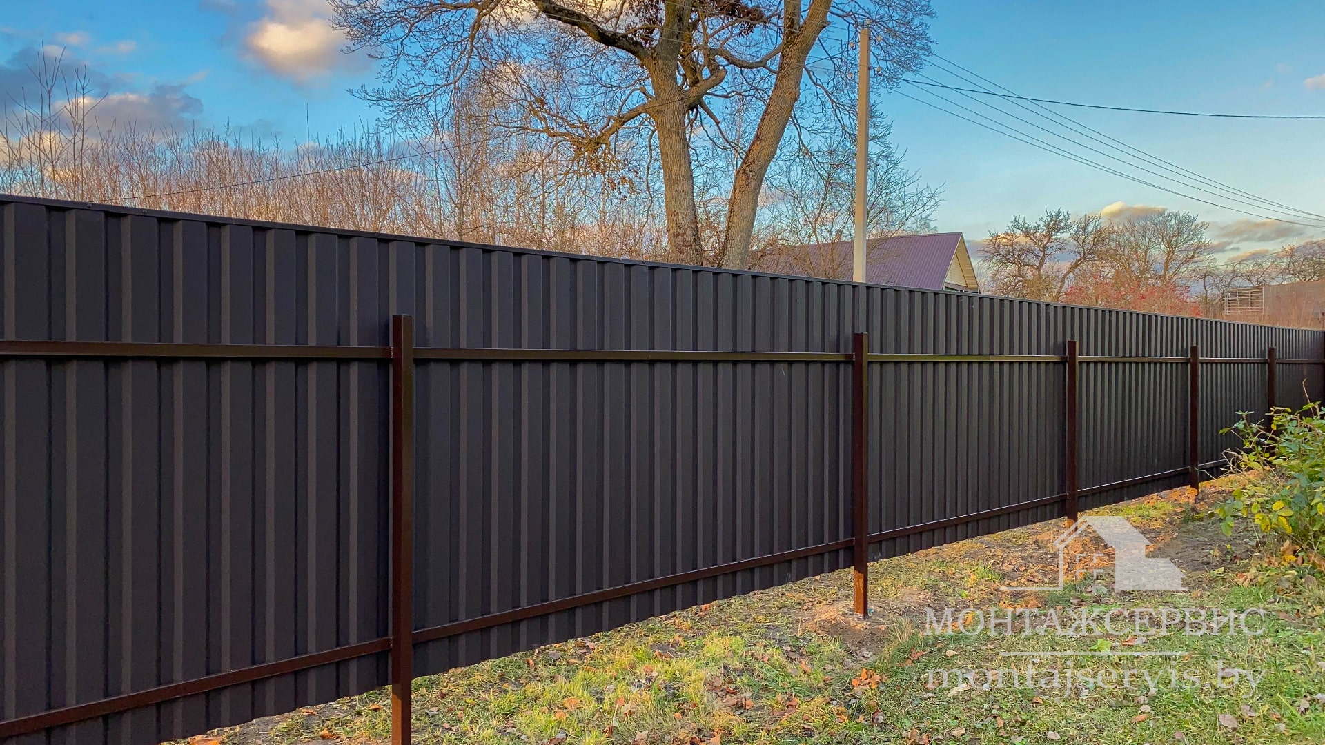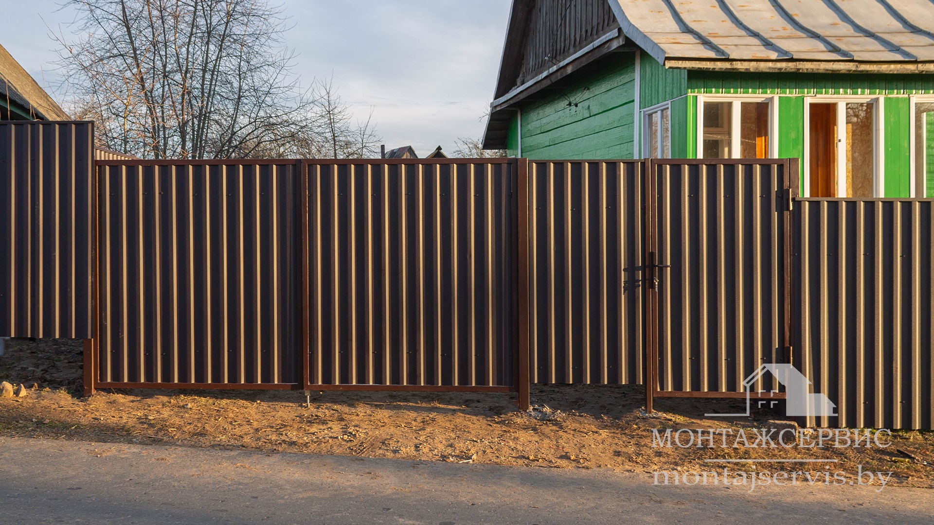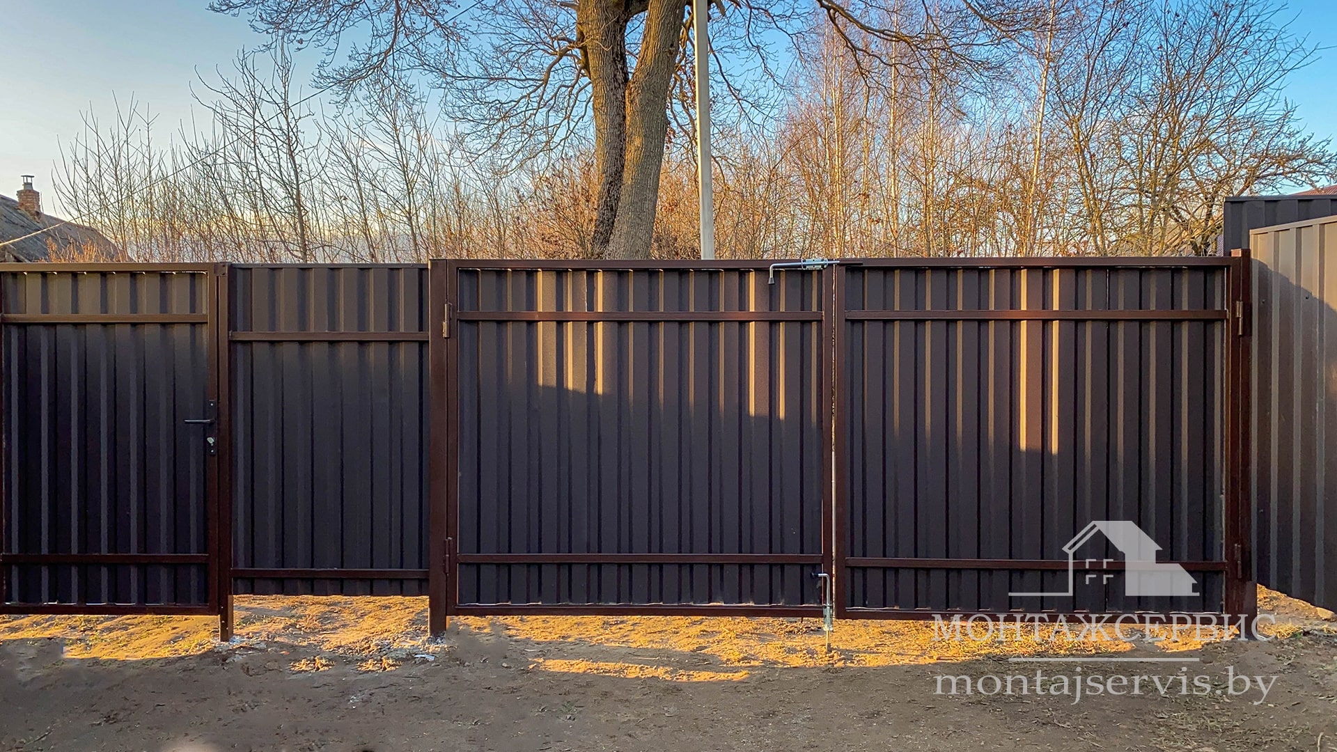 Монтаж забора из профнастила МП-20 RAL 8019 MAT + ворота распашные с калитка