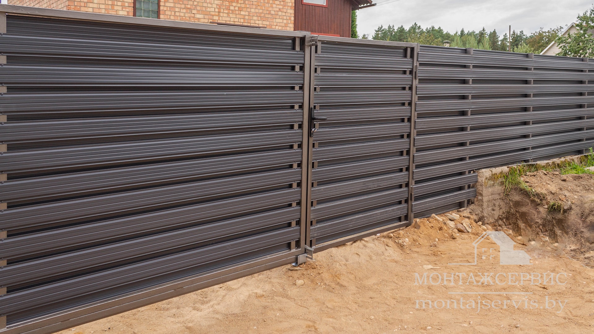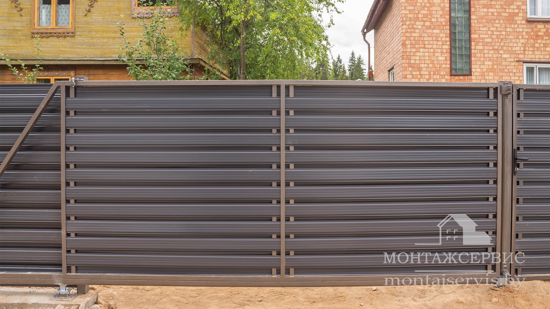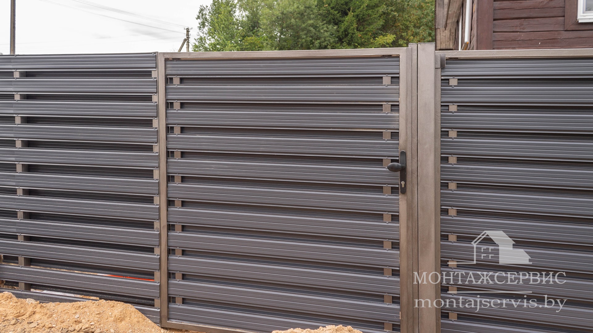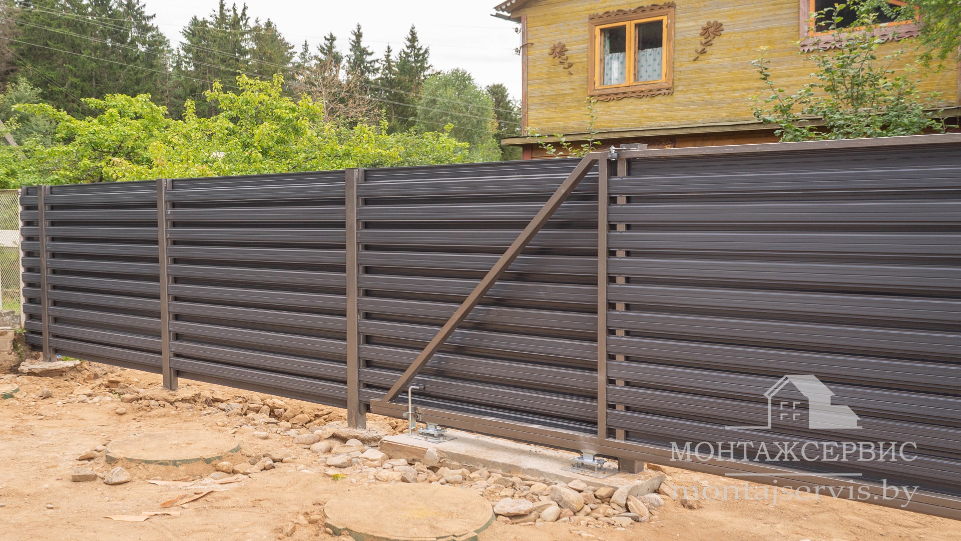 Монтаж забора РАНЧО из металлического штакетника "КЛАССИК" RAl 7024 + ворота откатные + калитка