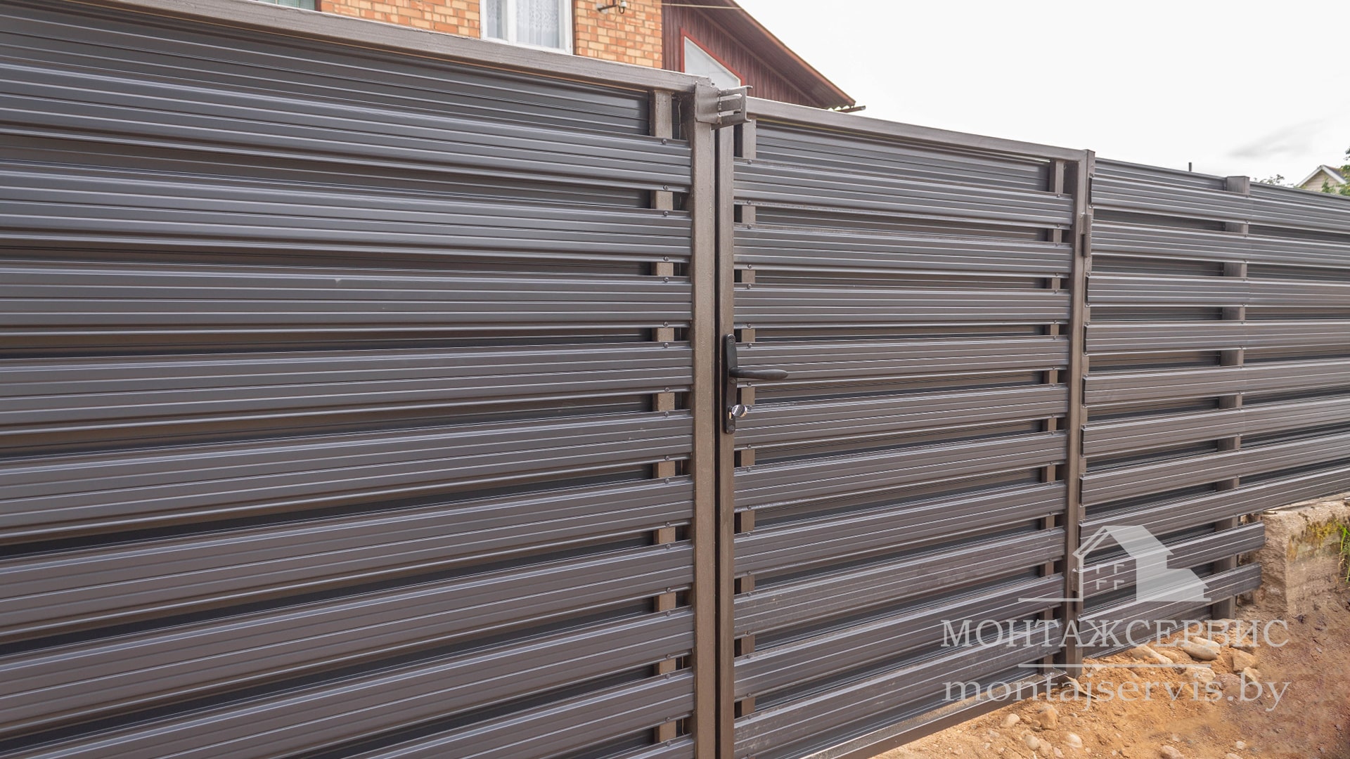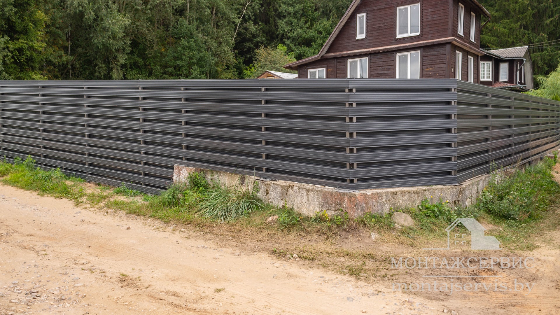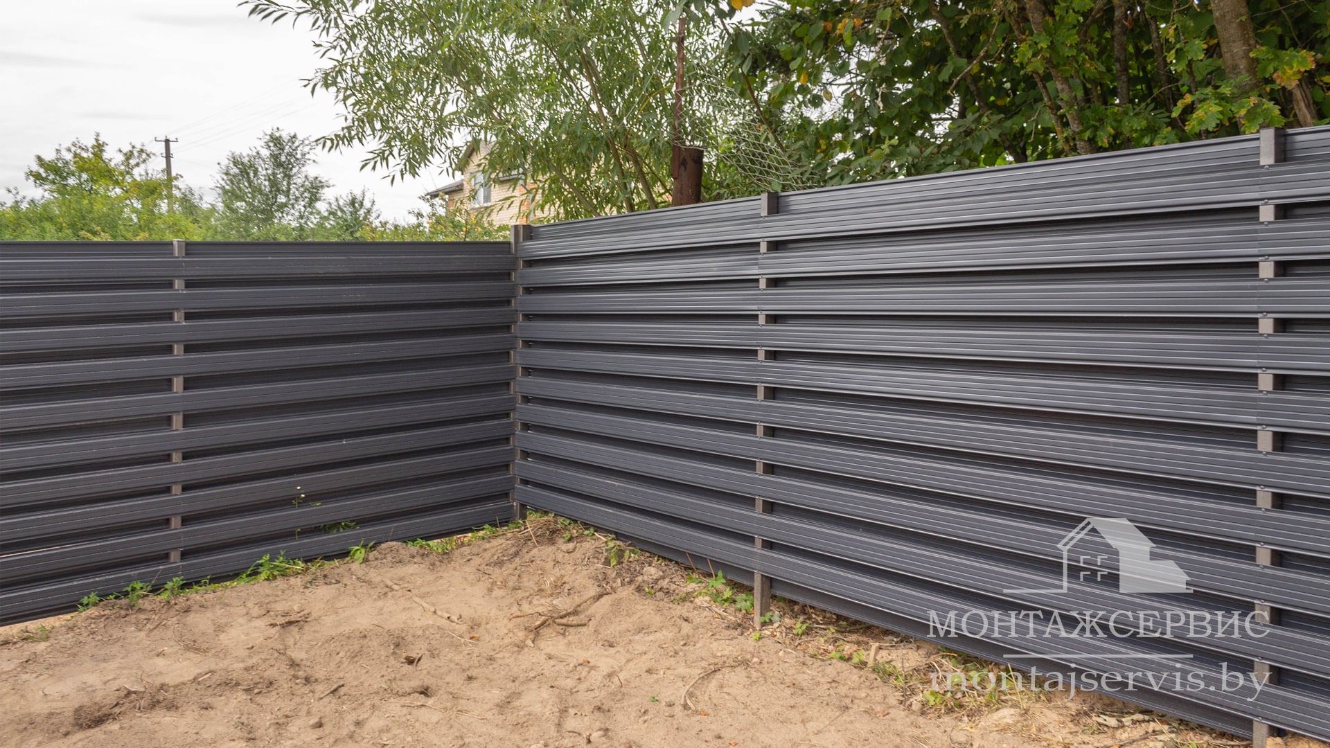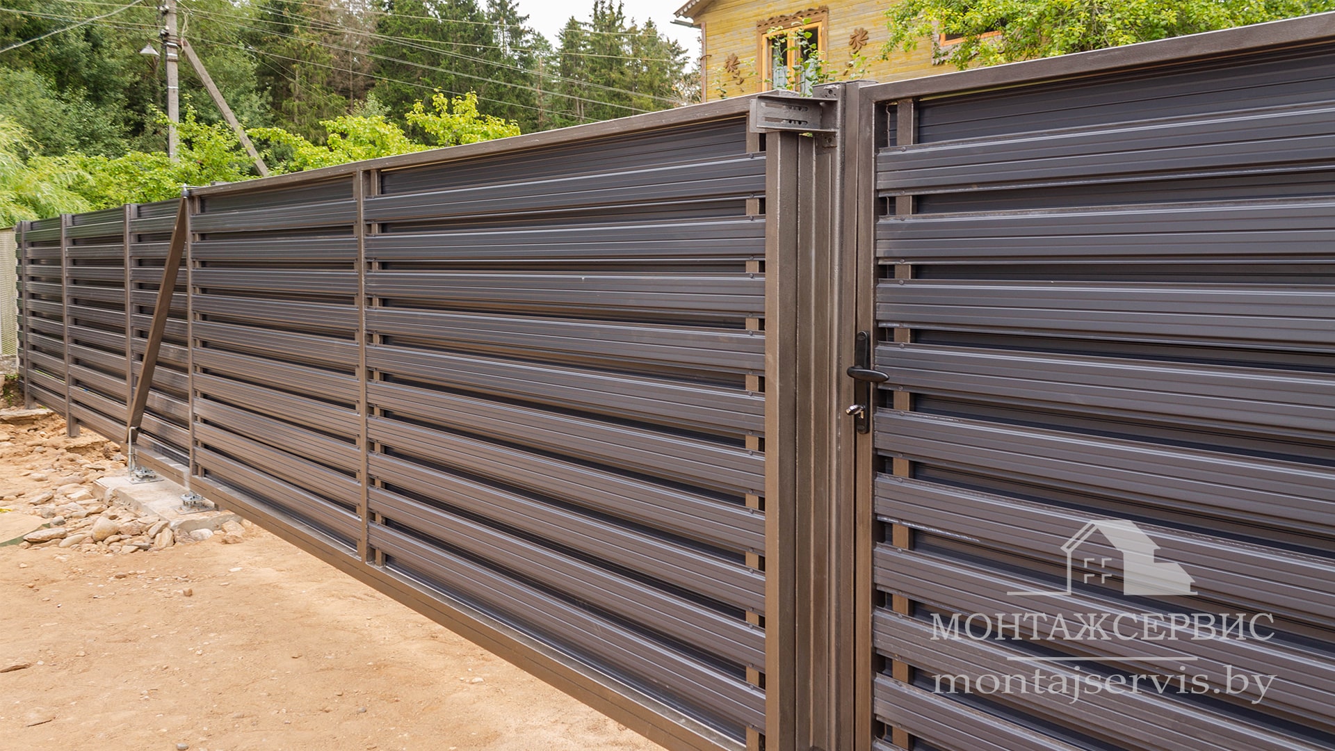 Монтаж забора РАНЧО из металлического штакетника "КЛАССИК" RAl 7024 + ворота откатные + калитка