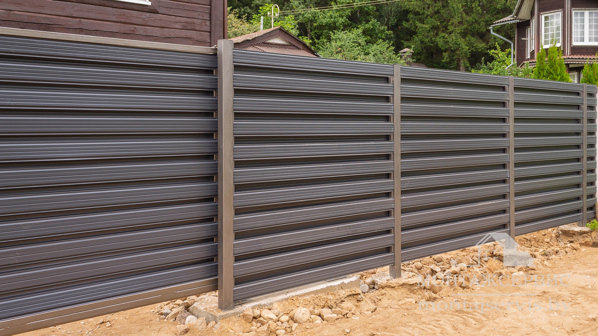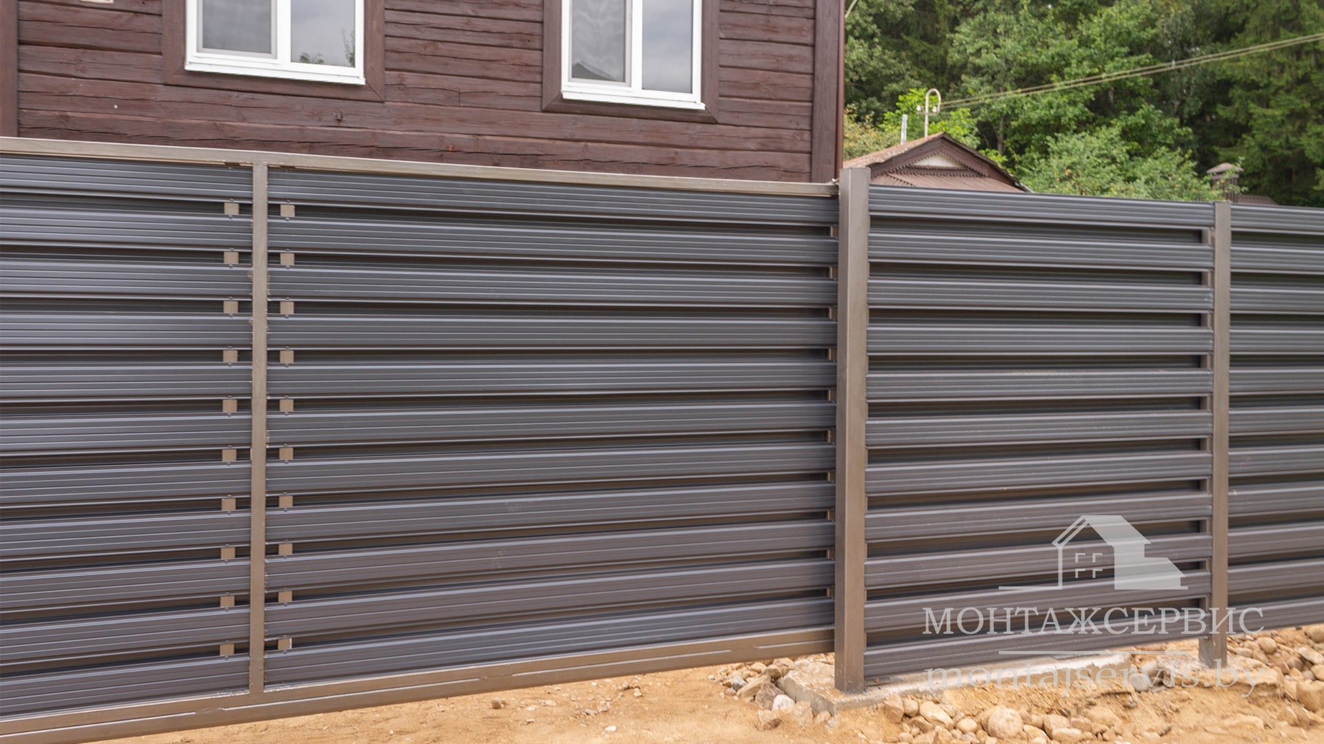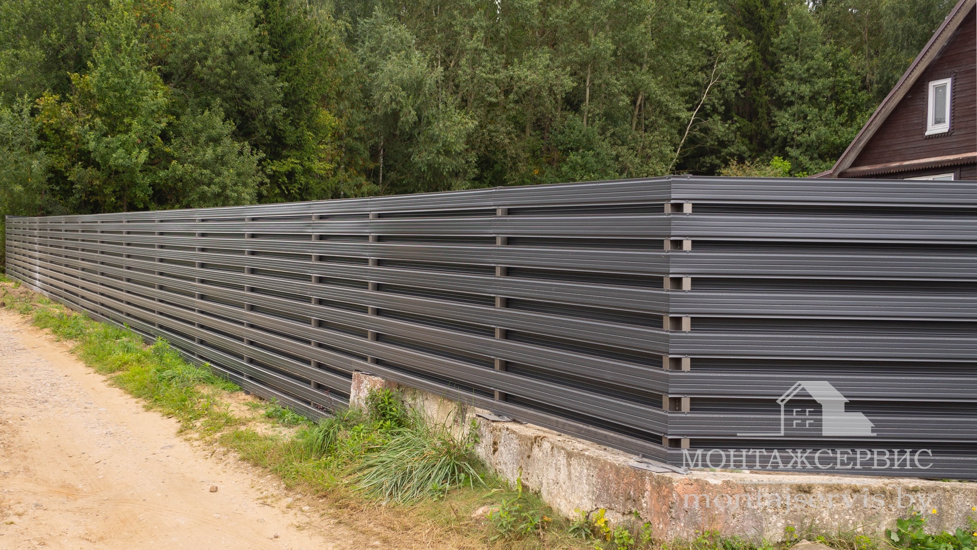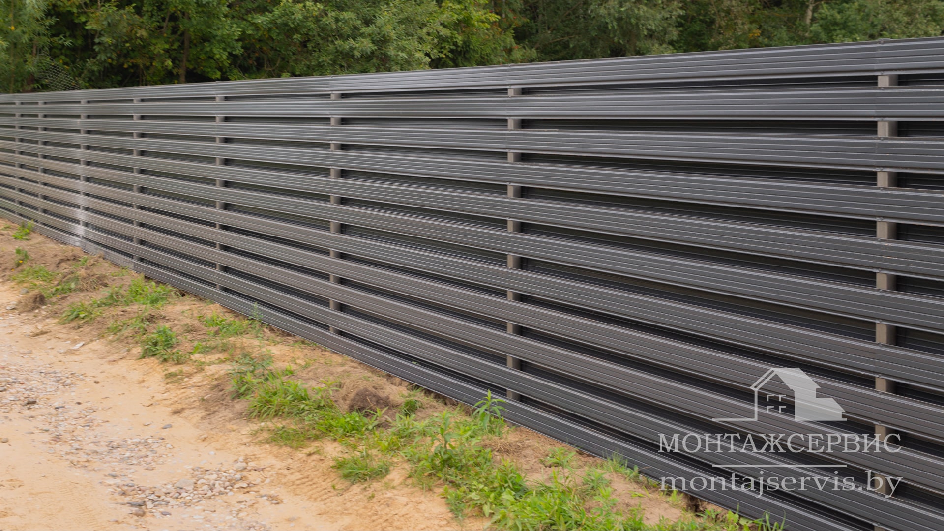 Монтаж забора РАНЧО из металлического штакетника "КЛАССИК" RAl 7024 + ворота откатные + калитка